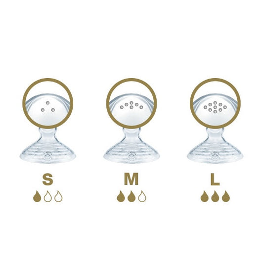 The teat, which is rated and recommended by mothers, midwives and paediatricians, is available with three different numbers of openings (S, M and L) – right for breast milk and up to thicker liquids.