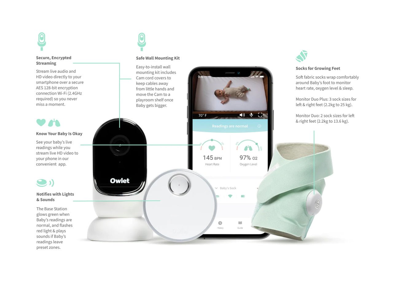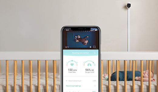 The Monitor Duo seamlessly pairs Smart Sock 3 with Cam 2 for a complete picture of Baby's well-being with the ability to track heart rate, oxygen level, and sleep trends while streaming HD video all in one place.