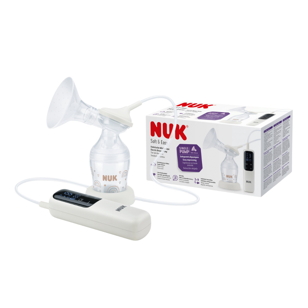 1 x NUK Soft & Easy electric single breast pump with rechargeable battery and soft breast cups; NUK Perfect Match baby bottle 150 ml included.