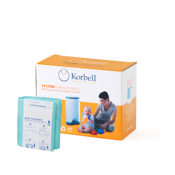 Korbell is a unique three part approach to odour control, starting with the trap door. The spring loaded trap door allow the nappy through and then immediately and automatically shuts the odour from escaping. The top lid also acts as a secondary seal for double protection against odour. The strong, powder-scented continuous refill is the third line of defence.