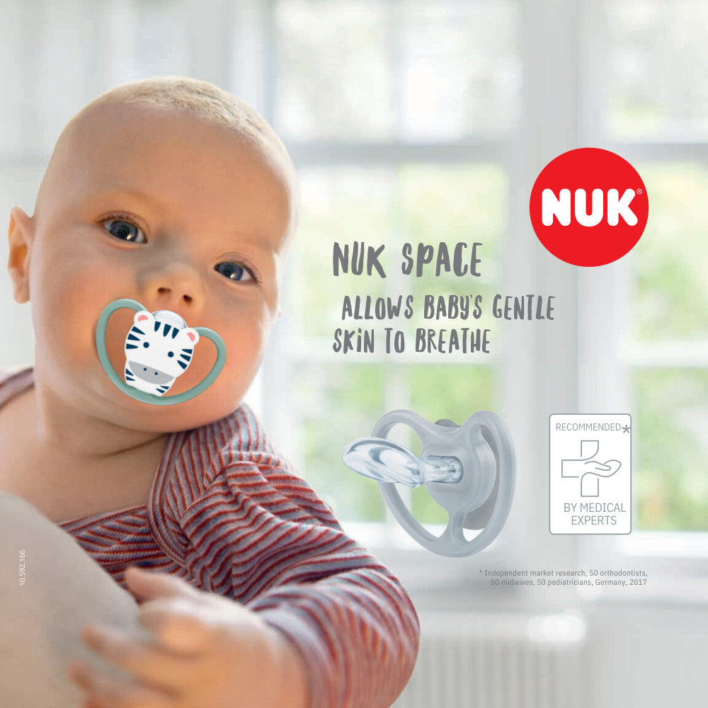 Our youngest babies not only have a mind of their own right from the start, but also completely different physical characteristics. Babies' young and delicate skin is particularly sensitive. NUK has designed the NUK Space Silicone Soother to protect this skin in the best possible way and to ensure the greatest comfort for your offspring at all times.