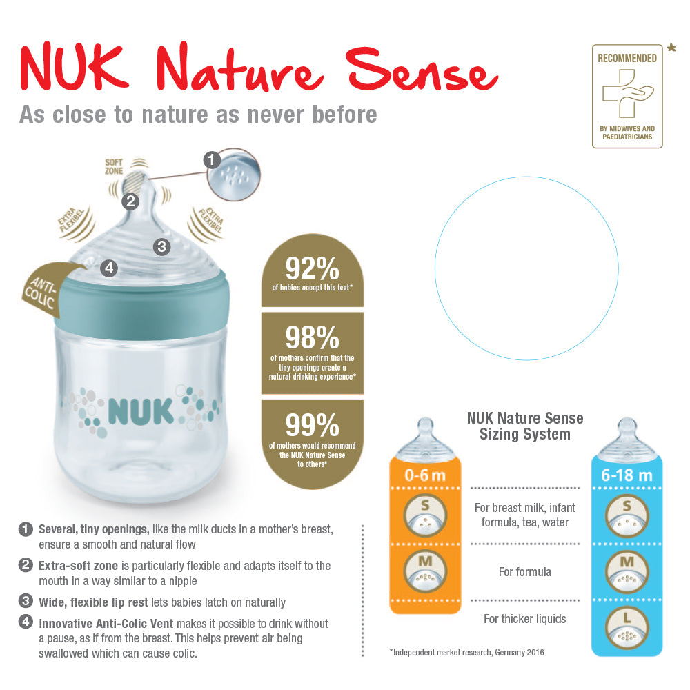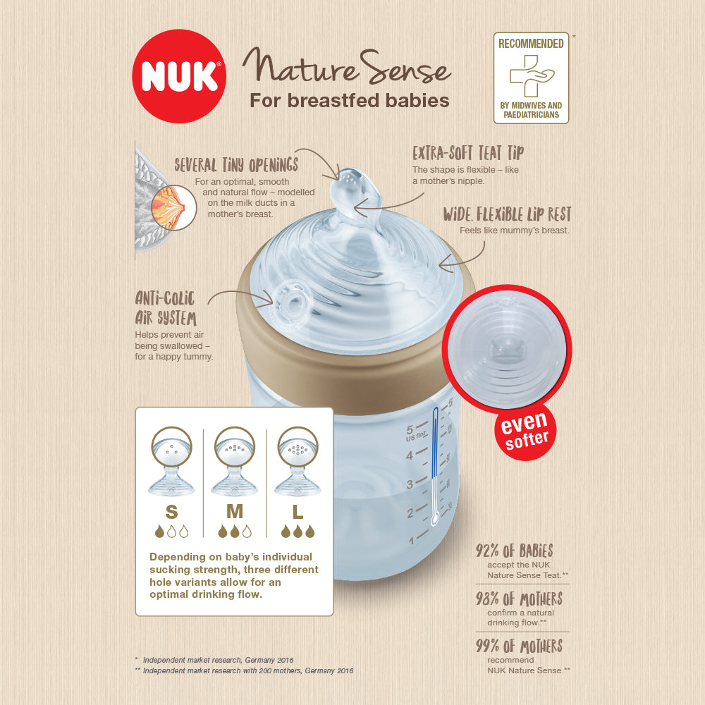 Nature sense is NUK's new premium range. The teat has several tiny openings which are modelled on the milk ducts in a mother's breast and make it a bottle that lets babies enjoy a familiar feeling when drinking and, above all else, a natural flow. And that is particularly important to us because with a natural feeling during bottle feeding, it makes it quite easy to change from breastfeeding to bottle feeding, bringing a lot of joy for you and your baby