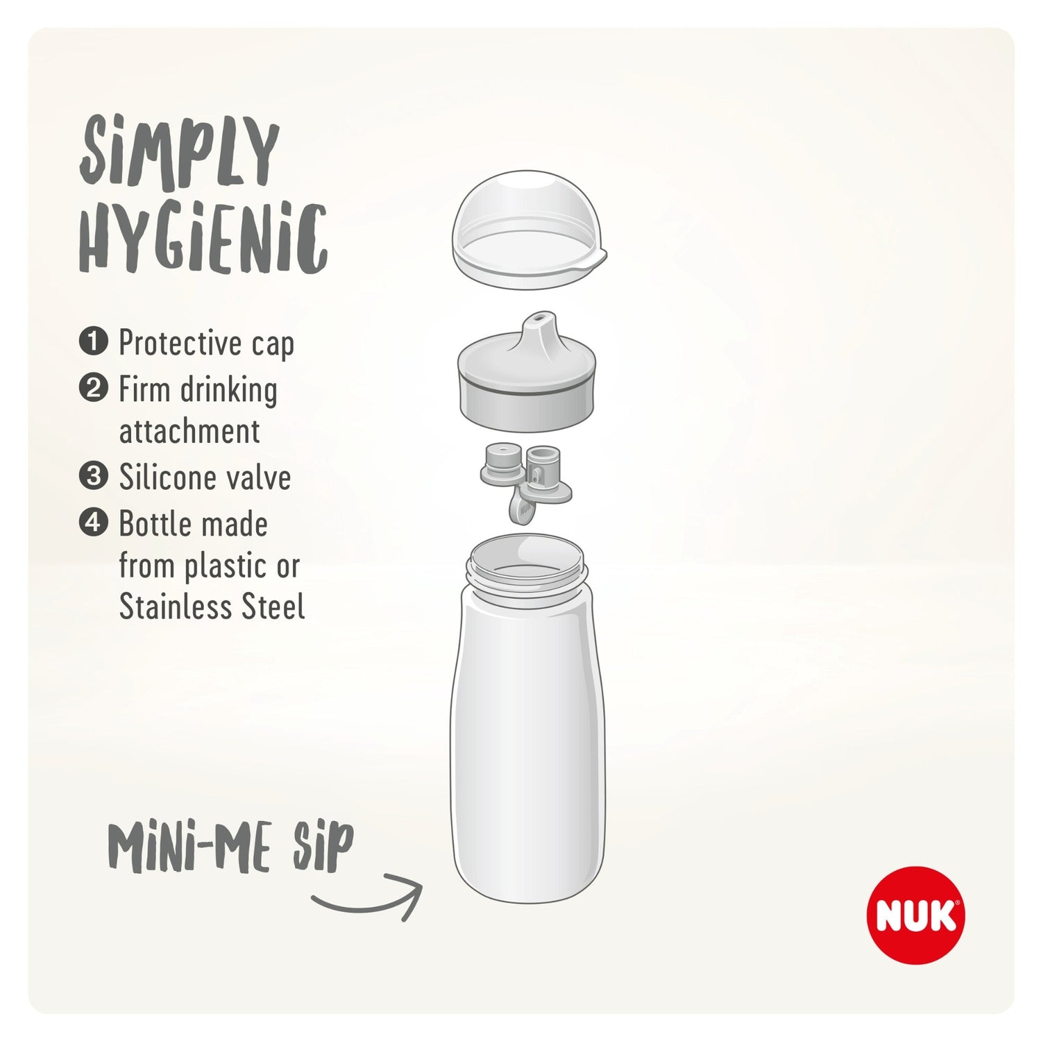 The NUK Mini-Me Sip bottle is a reliable companion for every day and for children from 9 months old. The innovative top easily withstands little teeth. With the innovative 2in1 top, your child can choose whether to use the straw or not. Either way, the bite-resistant material easily withstands little teeth. A clear commitment to sustainability and quality.Â