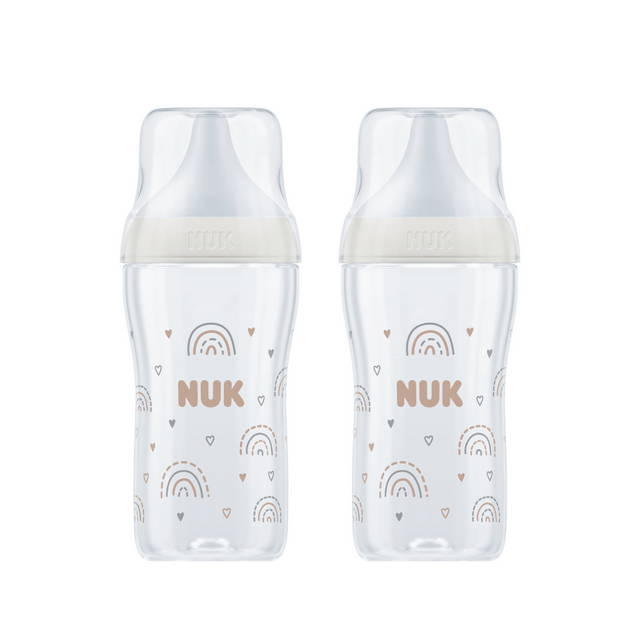 The NUK Perfect Match Twin Set, which includes 2 x 260 ml Perfect Match bottles with a soft and flexible silicone teat.