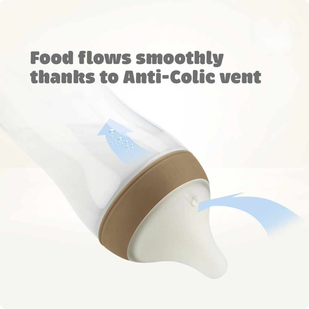 are choosing a bottle with an anti-colic feature. All NUK bottles feature an innovative Anti-Colic vent system which helps to reduce the risk of infant colic. The valve allows air into the bottle during feeding which prevents an air vacuum and allows baby to feed continuously without swallowing air. In addition, always ensure your baby has a good seal around the nipple to prevent baby from swallowing air from the sides of their mouth.